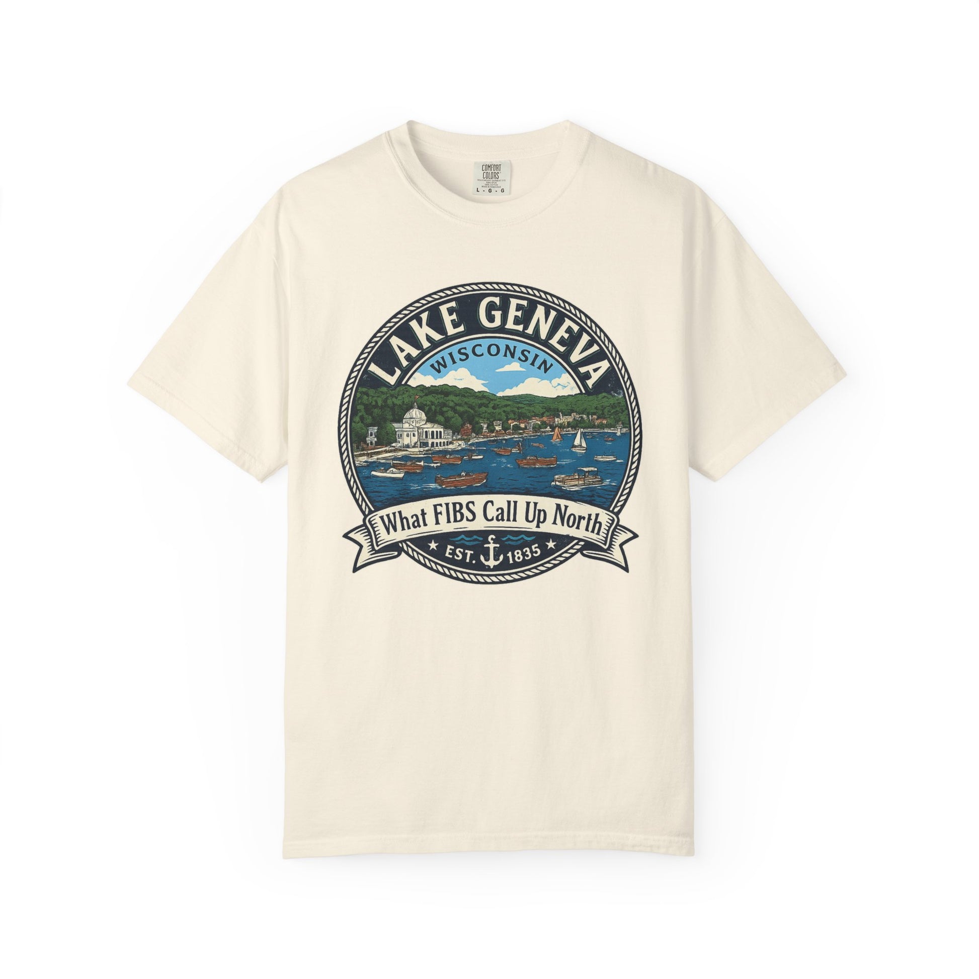 Celebrate Wisconsin pride and lakeside nostalgia with this Lake Geneva graphic tee, featuring a vintage-style emblem of boats, the iconic Riviera Theater, and the cheeky slogan “What FIBS Call Up North.” Whether you're a local, a lake lover, or just enjoy Midwest humor, this shirt blends scenic charm with regional wit.